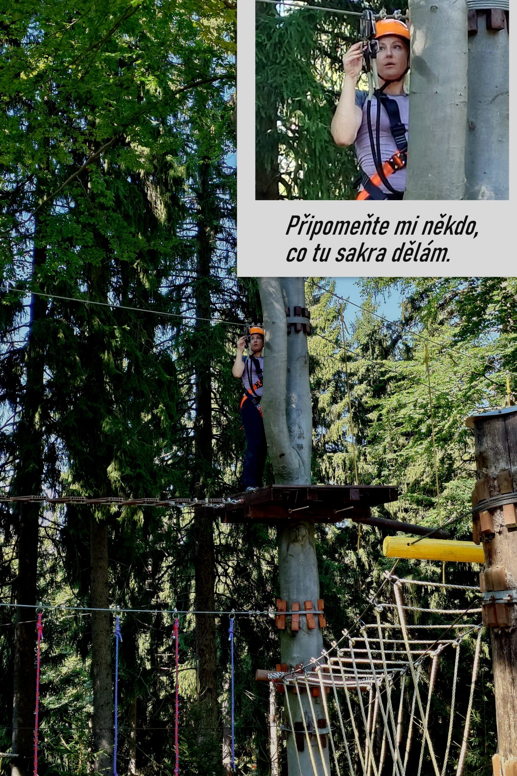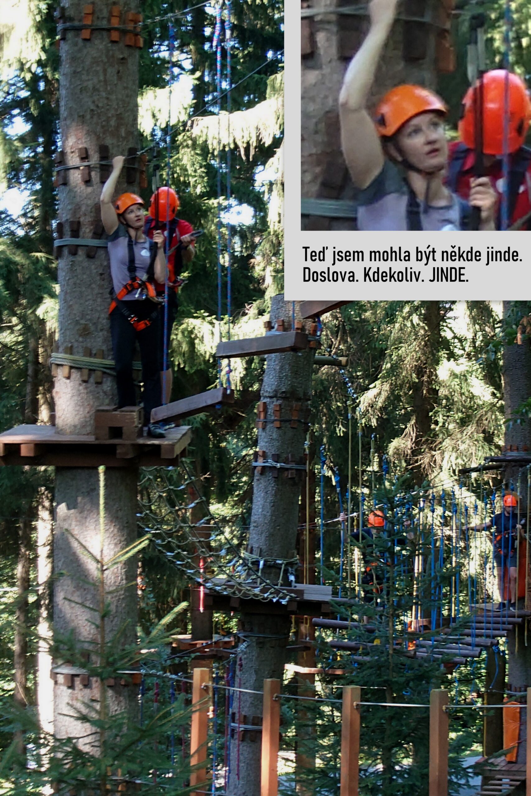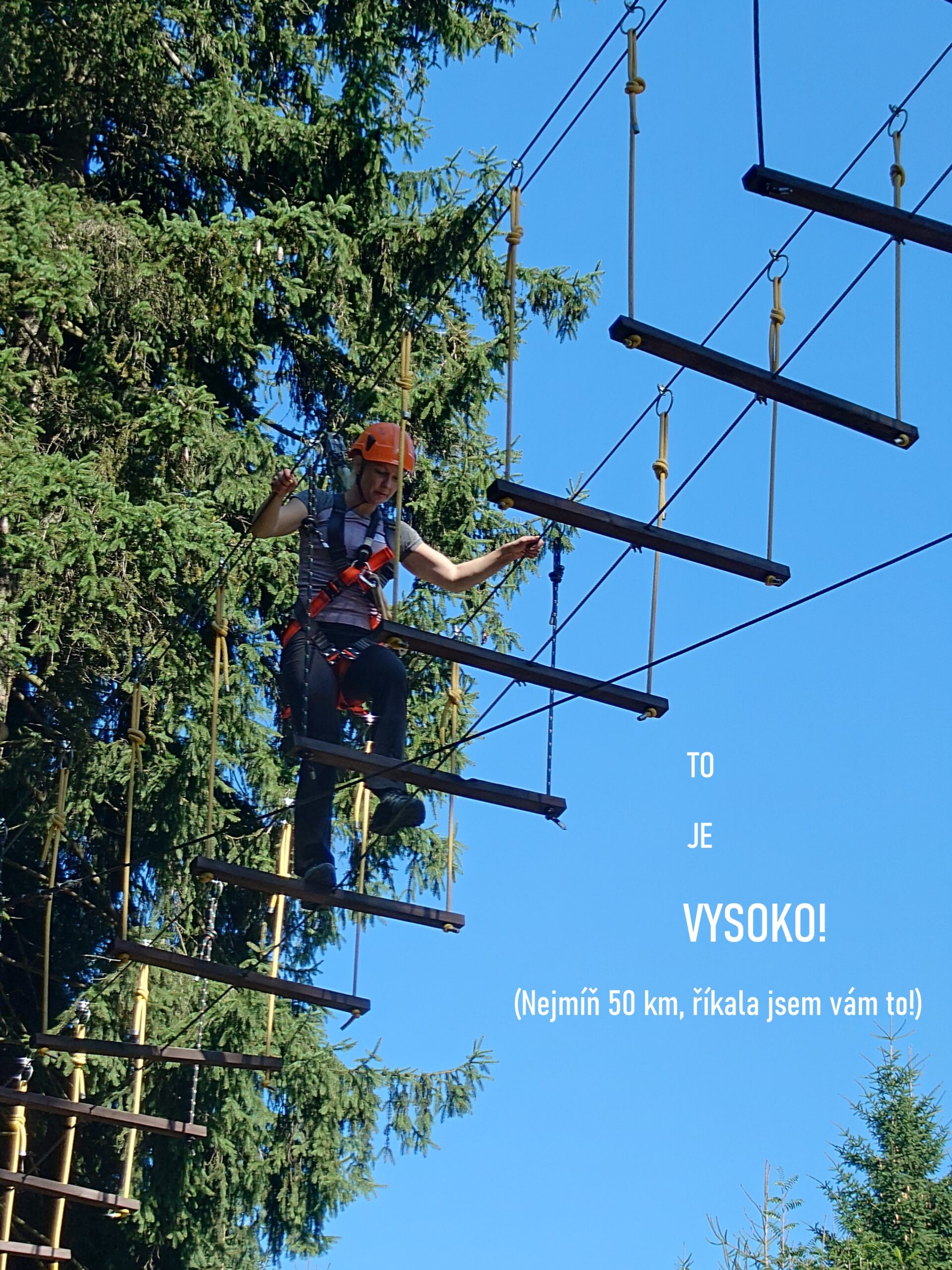 Před časem jsem navštívila lanové centrum. Tušila jsem, že to pro mě nebude snadné, že čím jsem starší (pardon, chtěla jsem říct „čím jsem déle mladá“), tím hůř snáším výšky. Ale až když mě zakšírovali a vylezla jsem těch 50 kilometrů nahoru (jo, bylo to 50 kilometrů – nejmíň!), zjistila jsem, jak velký problém mám.