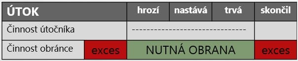 • probíhá mimo dobu útoku, tedy dříve, než útok skutečně přímo hrozí, nebo poté, co již skončil (extenzivní exces).